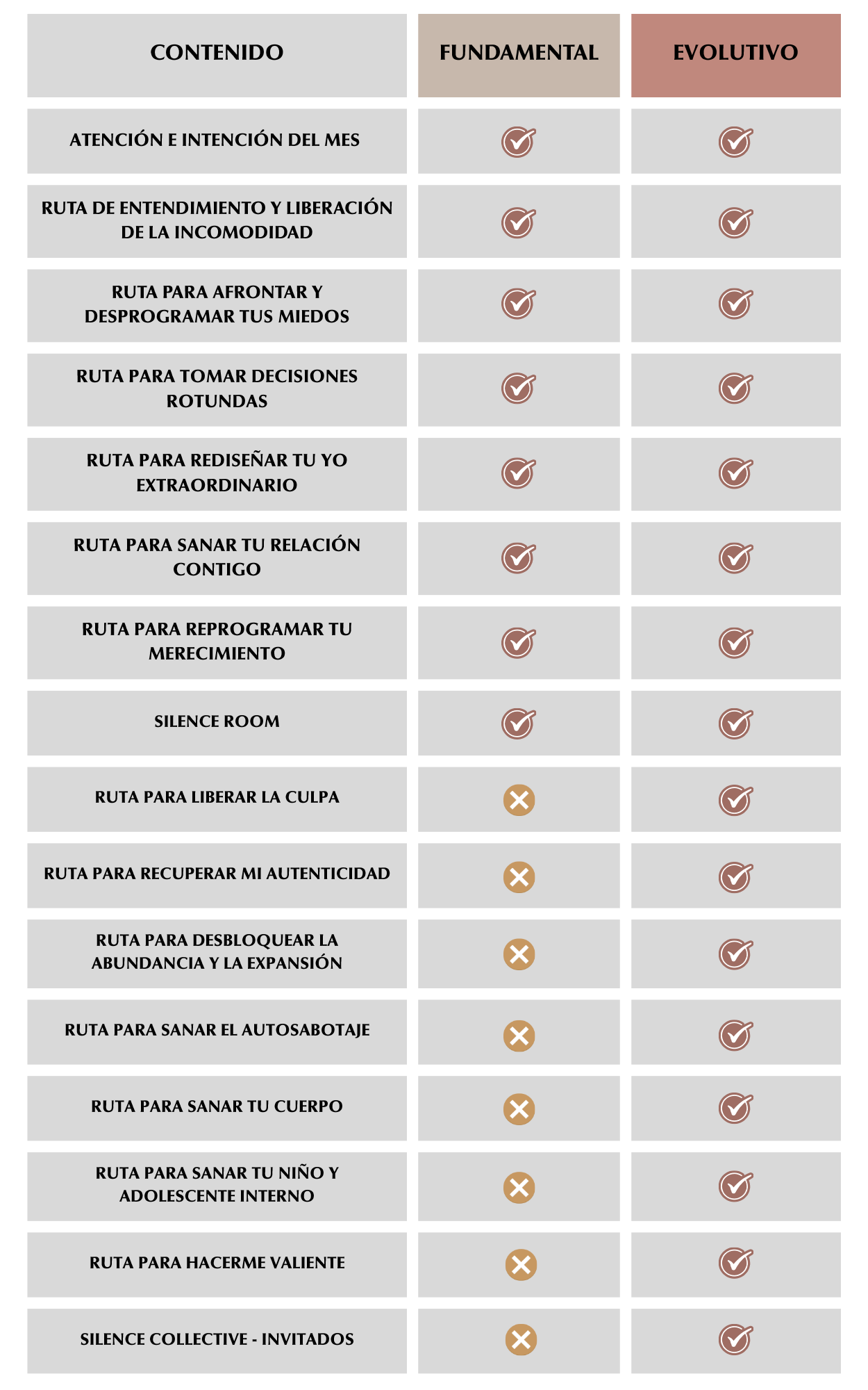 Ambas son membresías a las que te suscribes. Ambos contienen las Rutas de Transformación, Prácticas Diarias y la Atención e Intención de cada mes. La diferencia es que el Evolutivo es más completo, y el compromiso es por al menos 6 meses ya que encontrarás los workshops más avanzados para un trabajo altamente profundo y transformador. Además, te conviertes en parte de un círculo muy pequeño y exclusivo donde a través de conversaciones mensuales con invitados especiales o terapias de Silencio en vivo, podrás ampliar tu visión de lo posible y tu capacidad de convertirte en el co-creador de la Vida que mereces. Si te las pierdes podrás ver la grabación.